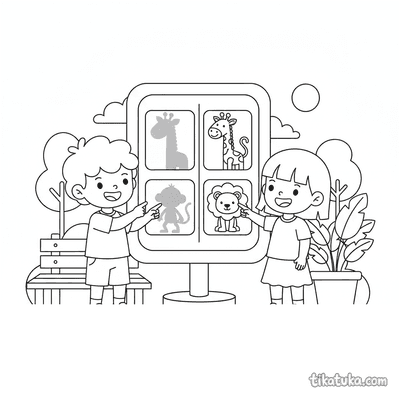 Kinder ordnen Schatten Tieren auf dem Zoo-Spielschild zu