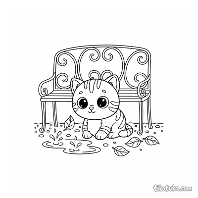 Kätzchen sucht Schutz unter Gartenbank im Regen