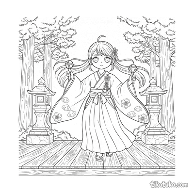 In dieser Sammlung findest du Szenen, in denen Schreinmädchen den Kagura-Tanz üben, Laternenumzüge zum Schrein stattfinden oder Fuchswesen wie der Kitsune gefüttert werden. Auch rituelle Handlungen wie das Reinigen eines Torii-Tores oder das Fegen mit einem Kodama-Geist sind als Motive dabei. Die klaren Schwarz-Weiß-Konturen der Malvorlagen eignen sich ideal zum Ausdrucken. Du kannst alle 14 Schrein-Bilder einzeln herunterladen oder sie direkt im Browser online mit Farben füllen.