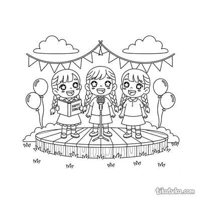 In dieser Sammlung gibt es Ausmalbilder mit Kindern im Chor, Solosängern auf der Bühne und musikalischen Ponys. Du findest Szenen von einem Mädchen, das Vögeln vorsingt, einem Kinderchor beim Festival oder einem Dorfmusikanten am Brunnen. Die schwarz-weißen Umrisse sind klar und einfach, sodass Kinder die Figuren gut erkennen und ausmalen können. Alle 18 Malvorlagen zum Thema Singen kannst du direkt herunterladen und ausdrucken. Du kannst die Seiten auch bequem als PDF-Sammlung speichern, um mehrere Bilder auf einmal zu drucken. So hast du immer eine Auswahl an musikalischen Motiven für deine Kinder parat.