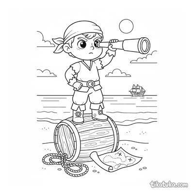 Junge mit Fernrohr auf Piratenfass