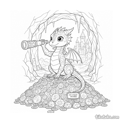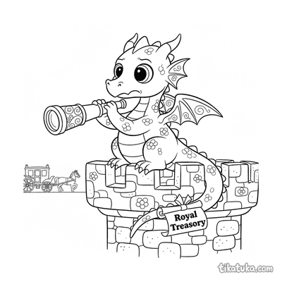 Drachenjunges auf Schatzhort mit Fernrohr