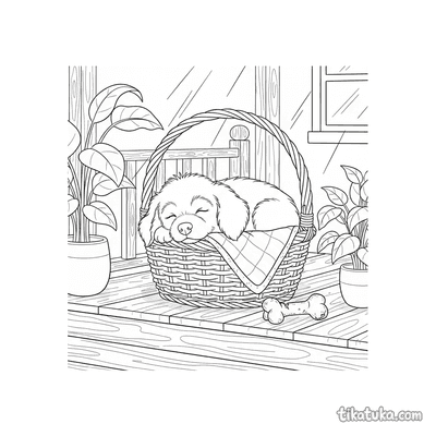 Schläfriger Welpe im Korb auf den Veranda-Stufen