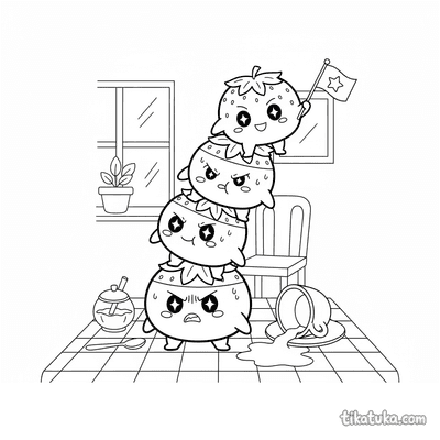 In den Bildern tummeln sich niedliche Erdbeer-Mochi-Figuren, die gemeinsam spielen, musizieren oder auf einem Haufen Erdbeeren balancieren. Es gibt auch Szenen mit einem schĂŒchternen Mochi hinter einer Riesen-Erdbeere, einem Mochi in einer Erdbeerdecke und einer fröhlichen Erdbeere mit Hut auf einer Picknickdecke. Die klaren Schwarz-WeiĂ-Konturen aller Motive sind ideal fĂŒr kleine HĂ€nde und machen das Ausmalen einfach. Du kannst die gesamte Sammlung bequem herunterladen oder einzelne Vorlagen direkt ausdrucken, um sofort mit dem Malen zu beginnen.