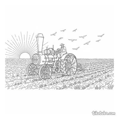 Alter Dampftraktor pflügt Feld bei Sonnenaufgang