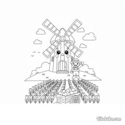 Windmühle auf Hügel mit Tulpenfeld