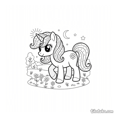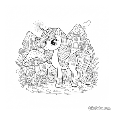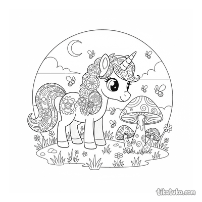 Einhorn-Pony mit Uhrwerk-Mähne auf leuchtender Pilzwiese