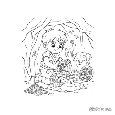 Steinzeitjunge als Erfinder, der ein Rad schnitzt