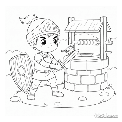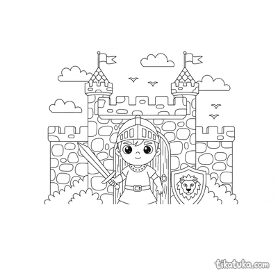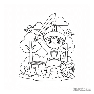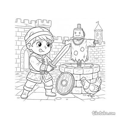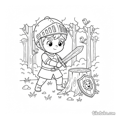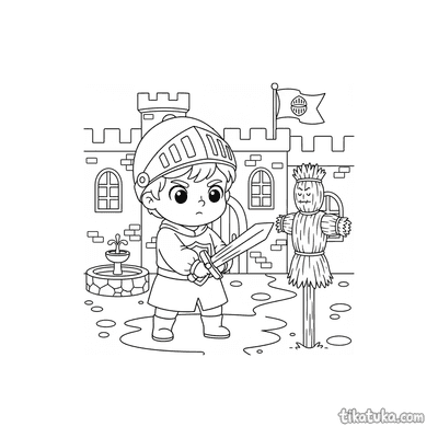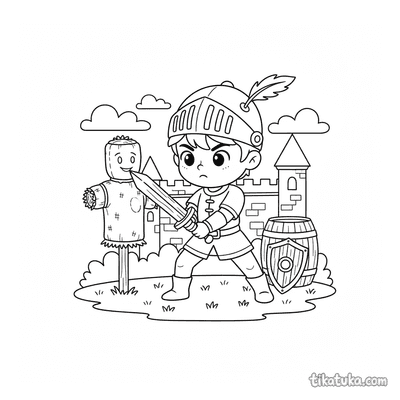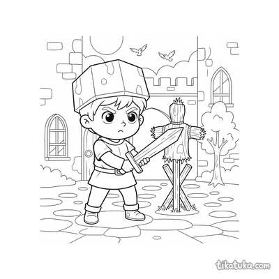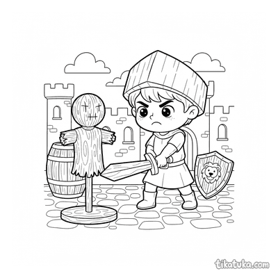 Diese Malvorlagen zeigen das klassische Holzschwert als Spielzeug für junge Ritter. Die Szenen stellen verschiedene Übungsmomente und Trainingssituationen dar.